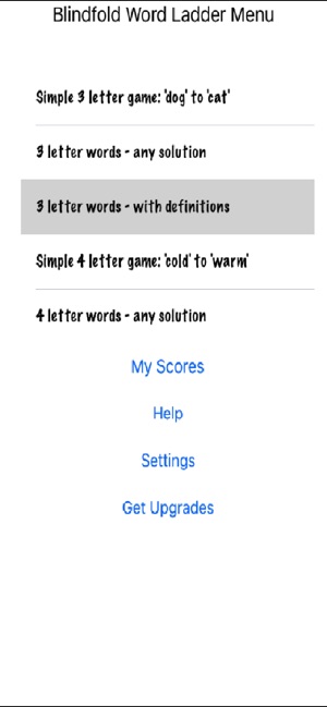 Blindfold Games are entertainment apps provided as a service to the visually impaired community by Objective Ed. Your in-app upgrades pay for the development and support of these games.  Word Games is a fully accessible word game for both sighted and visually impaired people, designed for rapid audio play. Word Games includes the games Word Ladder, Word Flick, Hangman, Unscramble and 7 small words. The objective of Blindfold Word Ladder is to convert one word into another word by changing only one letter a a time. For example, to change the word 'COLD' to 'WARM', you can first change the third letter of COLD from 'L' to 'R', making the word CORD. Then change the second letter of 'CORD', so the new word is 'CARD', then the fourth letter of 'CARD', so the new word is 'WARD'. Finally change the last letter of 'WARD', so the new word is 'WARM'. In Word Flick, you have a 16 randomly chosen letters arranged in a 4 by 4 grid. You build as many words as possible using adjacent letters. The longer the word, the higher you score. For example, if the top line has the letters C, A, T, S, and the second line has the letters O, L, D, X, you could form CATS from the first line and COLD using the C from the first line, and the O, L, D from the second line. In Unscramble, you must unscramble the word. The letters L, E, H, O, L unscramble to become the word HELLO. In Hangman, you must discover the word before using up your moves. Word Games was suggested by several blind gamers who enjoyed Blindfold Color Crush and Blindfold Tile Puzzle.