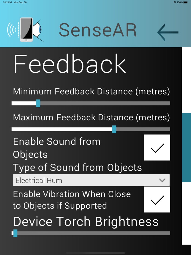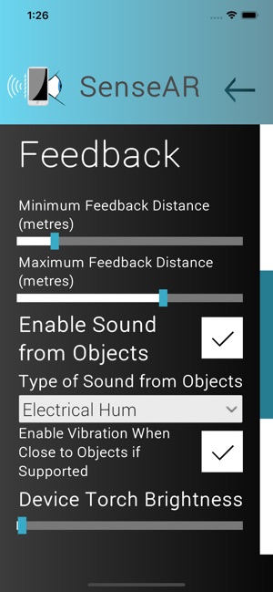SenseAR is designed to assist visually impaired or blind people by translating what it can see using the camera into sound and vibration*. Think of the app like a car’s parking sensor alerting you as your device gets closer to objects by either playing sound from the direction of the object or vibrating with increased intensity* (on supported devices). The app supports VoiceOver when it is enabled on the device and works best with headphones that provide good directional sound such as the Apple headphones. The app should only be used within safe environments and to supplement existing tools. We are actively looking to improve the application and have a number of features we are looking to develop soon. We also welcome your suggestions so please do contact us using the form on our website ( https://tinyurl.com/ActRContact ) with any suggestions of ways in which we can improve the app. The app will make use of the wide angle lenses on the newer iPhones to provide object detection at a wider angle, this reduces the need to move the device in a scanning side to side motion as you walk so the device can detect objects to the sides of where you are walking. To note: The app will be more accurate on dual lens devices, accuracy can also be improved particularly on single lens devices by moving the device in a slow side to side motion while still facing the direction of travel. Ideally hold the device at an angle of around 45 degrees at waist height facing the direction of travel so the device can see obstacles ahead. *=Vibration is only supported on certain devices this is currently the iPhone 7 and newer, however this is subject to change. Vibration can be turned off within the settings. App preview video music: Once Again from Bensound.com